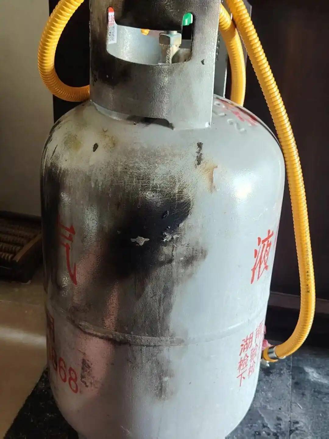 周女士说,洗衣机旁边就是液化气罐,是前天被放在那里准备做饭,周女士向记者发来了图片,液化气罐的外表已经被熏黑,事后液化气罐也被抬走了。