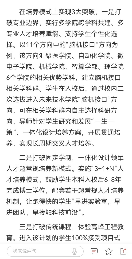 从2025年开始,天津大学拟在2年内面向国家战略急需和新兴领域,瞄准未来产业和科技发展方向,分批次重点建设集成电路智能芯片与微系统、人工智能、量子科技、柔性电子、合成生物学、地球系统工程、脑机接口、具身智能、新型储能、低碳化工、新材料11个培养方向。